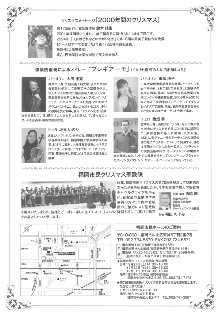 福岡市民クリスマスは、福岡の教会が教派を超えて毎年12月初めに市民の皆様をお招きして、クリスマスの喜びをみんなで共に分ち合うために行われています。